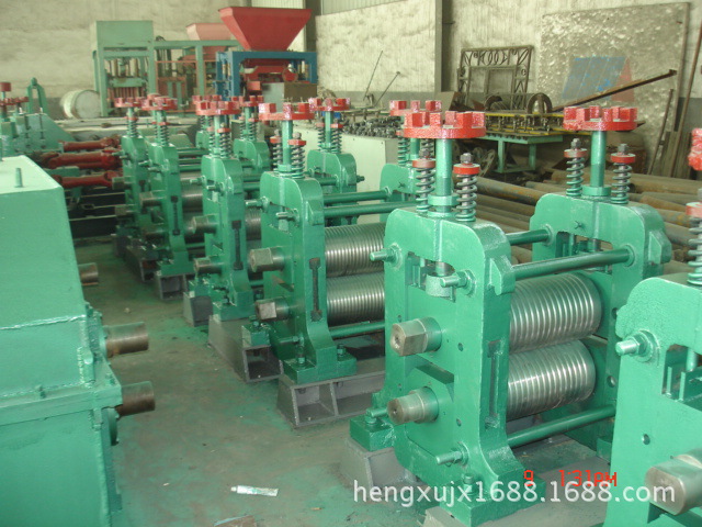 連續(xù)小型軋機(jī)所用坯料一般是連鑄小方坯,邊長一般是130-160mm,長度一般6-12m左右,坯料單重1.5-3噸。軋制線多為平立交替布置,實(shí)現(xiàn)全線無扭轉(zhuǎn)軋制,根據(jù)不同坯料規(guī)格和成品尺寸有18、20、22、24架的小型軋機(jī),18架為主流。目前棒材軋制多采用步進(jìn)式加熱爐、高壓水除鱗、低溫軋制、無頭軋制等新工藝,粗軋、中軋則向大坯料及提高軋制精度方向發(fā)展,精軋機(jī)主要是提高精度和速度,較高速度可達(dá)18m/s,產(chǎn)品規(guī)格一般為Ø10-40mm,也有Ø6-32mm或Ø12-50mm的。生產(chǎn)的鋼種為市場大量需求的低中高碳鋼、低合金鋼。其生產(chǎn)工藝流程是:步進(jìn)式加熱爐→粗軋機(jī)→中軋機(jī)→精軋機(jī)→水冷裝置→冷床→冷剪→自動計數(shù)裝置→打捆機(jī)→切料臺架。