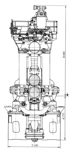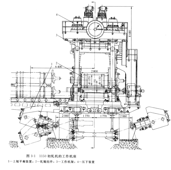 國產(chǎn)1150初軋機(jī)的主傳動(dòng)形式為兩個(gè)低速直流電動(dòng)機(jī)(功率4560kw,轉(zhuǎn)速0-70-120r/min)通過萬向連接軸分別傳遞兩個(gè)軋輥。上軋輥的主連軸器放在下軋輥主電機(jī)的上面。工作滾名義直徑為φ150mm,重車后較小直徑為φ1080mm,輥身長度為2800mm。1150初軋機(jī)的工作機(jī)座如圖3-1所示。他是由軋輥部件,機(jī)架部件,壓下平衡裝置等組成,但是每個(gè)部件都有其自己的特點(diǎn),與板帶軋機(jī)和型鋼軋機(jī)不同。
