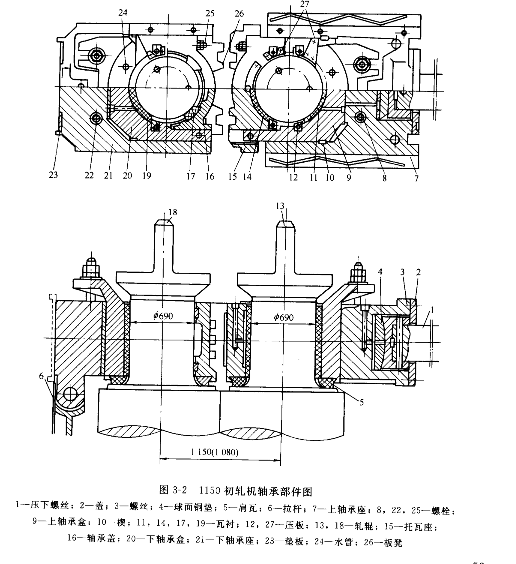 1150初軋機(jī)軋輥部件的結(jié)構(gòu)圖及立體示意圖如圖 3-2 及圖3-3所示。上軋輥放置在上軸承盒9及托瓦座 15 之間。瓦襯都是夾布膠木瓦,上軸承盒中有徑向瓦襯11 及肩瓦5,托瓦座中同樣也有徑向瓦襯14 及肩瓦。徑向瓦襯是用壓板 12定位。上軸承盒的腿插入托瓦座,并用螺栓 25緊固連接。初軋機(jī)與型鋼軋機(jī)不同點(diǎn)在于;在上軸承盒及機(jī)架間尚有一個(gè)上軸承座 7,上軸承座通過球面銅墊 4 與壓下螺絲1相接觸。軋制時(shí),軋制壓力通過上軸承盒、上軸承座、球墊、壓下螺絲較終傳遞給機(jī)架上橫梁。在上軸承盒的上部有兩個(gè)突耳,突耳通過固定在上軸承座的螺栓 8使軋輥進(jìn)行軸向調(diào)整。這種軸向調(diào)整的形式對于上軋輥移動(dòng)量極大且次數(shù)頻繁的初軋機(jī)是較理想的,這也是軋輥部件中多設(shè)置一個(gè)上軸承座的原因所在。上軸承座法蘭內(nèi)側(cè)鑲有耐磨滑板 28。