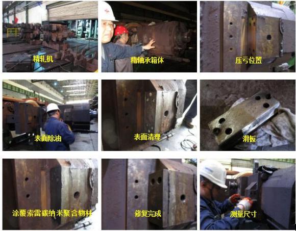 而目前索雷碳納米聚合物材料可以實(shí)現(xiàn)現(xiàn)場快速修復(fù),該材料具備優(yōu)越的粘著力,可以牢固附著在金屬基材表面,長期工作而不會(huì)脫落;產(chǎn)品自身具有極高的抗壓強(qiáng)度,在軋制力作用下,材料也不會(huì)損壞;獨(dú)特的材料良好的抗沖擊性能,可以吸收軸承座對牌坊的沖擊,避免了磨損的產(chǎn)生;同時(shí)產(chǎn)品具有良好的耐腐蝕性能,可使牌坊表面免受冷卻水的侵蝕。