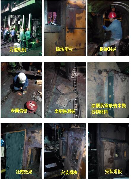 一般針對(duì)軋機(jī)牌坊滑塊位壓虧的問題,企業(yè)通常采用添加金屬墊片來解決此類問題,由于壓虧部位尺寸不均勻,導(dǎo)致其修復(fù)效果不理想。激光熔覆技術(shù)修復(fù)成本過高,工期長(zhǎng)等原因無法在短時(shí)間內(nèi)完成修復(fù),F(xiàn)場(chǎng)修復(fù)是近幾年興起的一種檢修模式,其原理是在不機(jī)加工的前提下,采用索雷碳納米聚合物材料修復(fù)技術(shù)在現(xiàn)場(chǎng)進(jìn)行修復(fù)。修復(fù)用的材料固化后形成的化學(xué)鍵連接作用力使其與修復(fù)的金屬部件形成優(yōu)異的粘著力,滿足設(shè)備在運(yùn)行中承受各種復(fù)合力的要求。此類修復(fù)材料性能較為可靠。