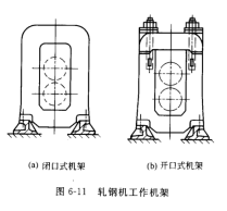 軋鋼機機架是工作機座的重要部件,軋輥軸承座及軋輥調整裝置等都安裝在機架上。機架要承受軋制力,必須有足夠的強度和剛度。機架的主要型式有開 口式和閉口式兩種, 如圖6-11所示。閉口式機架包括左、右立柱及上、下橫梁的一整體鑄件,其優(yōu)點是具有較好的強度與剛度。常用于軋制壓力較大或對軋件尺寸要求較嚴格的軋機上,如初軋機、鋼板軋機和冷軋機。這種型式的機架,換輥不方便,換輾時,軋輾是沿其軸線方向從機架窗口中抽出或裝入,這種軋機一般都設有專用的換輾裝置。開口式機架由機架底座與可裝拆的上橫梁組成。