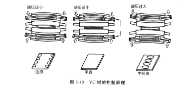 由于四輾軋機軋制負荷大,且工作輥直徑較小,因此,在一般四輾軋機上,都將支承輥用作 VC輥。其控制方法如圖6-39 所示,控制原理如圖 6-40 所示。油壓過小將使帶材產(chǎn)生邊浪,油壓過大將使帶材產(chǎn)生中間浪,只有油壓適中,才能獲得平直的帶材。
