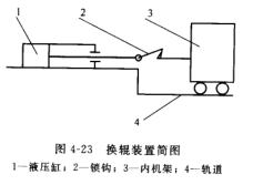 換輥裝置見圖如圖4-23所示,主要由液壓缸1,鎖鉤2,內(nèi)機(jī)架3及輥道4組成。