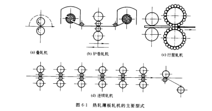 熱軋薄板有單張生產(chǎn)和成卷生產(chǎn)兩種生產(chǎn)方式,圖6-1所示為熱軋薄板軋機(jī)的主要型式。單張熱軋薄板主要是在單輥驅(qū)動(dòng)的二輾不可逆式軋機(jī)上用疊軋的方法進(jìn)行生產(chǎn),國(guó)內(nèi)1200疊軋薄板機(jī)屬于這一類(lèi),其成品厚度為0.2~3.7mm。這類(lèi)軋機(jī)工藝簡(jiǎn)單,設(shè)備少,故投資少,建廠快。但其勞動(dòng)強(qiáng)度大,生產(chǎn)率低,金屬消耗大,板材表面質(zhì)量不高,目前處于淘汰地位。